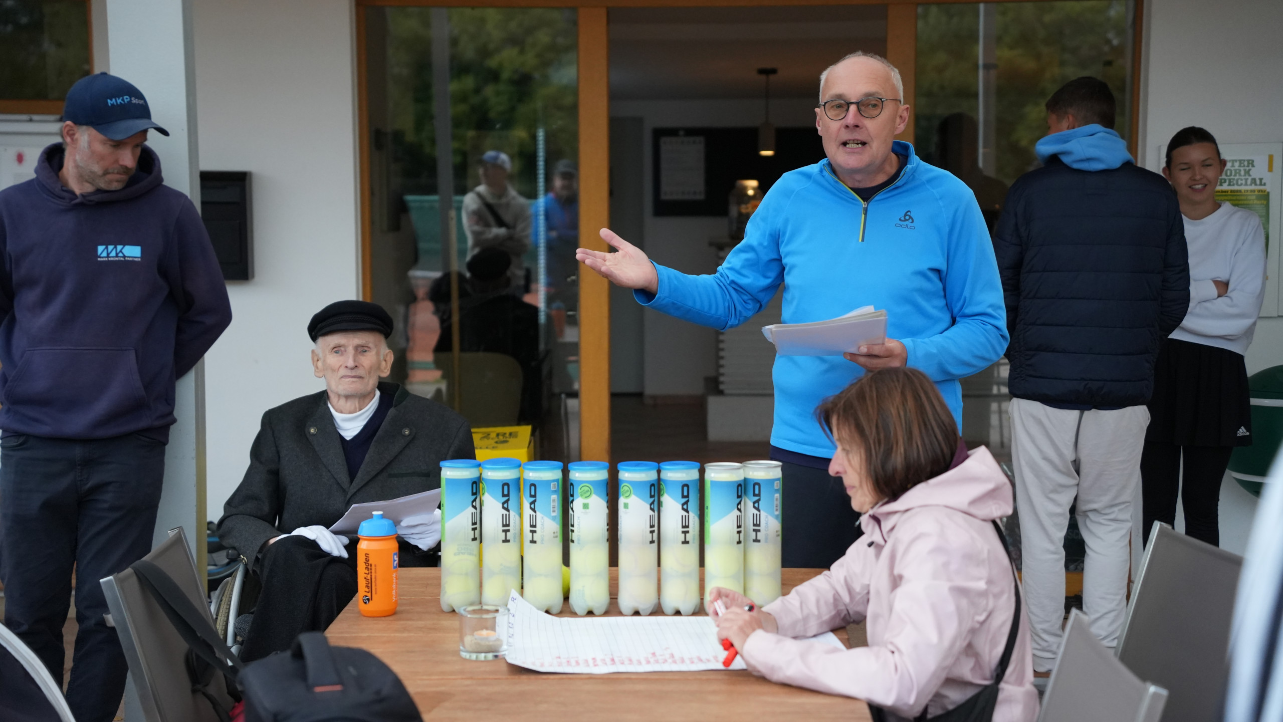 Nach der Übergabe des Ehrentrikot und einer gestalteten Geburtstagstorte an Kurt durch Präsident Henry Rahn startet das After Work Special. Ausführliche und lautstarke Erklärungen zum Ablauf stellte Turnierdirektor Steffen Kretschmar bereit. 28 Mitglieder aller Altersgruppen stürmten danach auf dem Platz um bei schwindendem Licht noch möglichst viel Tennis zu spielen. Bei dem bunten Treiben ging es hoch her oder flach über das Netz. Alle liefen, sprangen und schlugen teilweise großartig Bälle, doch am Ende gewann wieder Marius Portanac, zum dritten Mal hintereinander . Bei „Mister After Work“ kann „Florian“ nun überwintern.