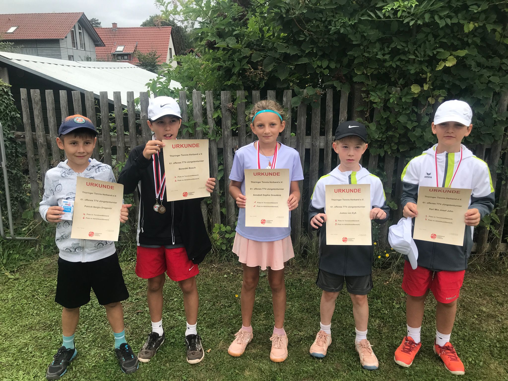 Anabell Sophie Graudenz (Mitte) gewann bei den Mädchen. Bei den Jungs kam Benedikt Bosch (2. v. l.) auf Platz 2 gefolgt von Karl Mio Josef John (rechts) und Patrick-Sergiu Dragomir (links) auf den Plätzen 3 und 4. Justus von Eyss (2. v. r.) kam mit 3 Siegen und 2 Niederlagen auf Platz 9. Beachtlich sind die Ergebnisse von Karl und Justus die ihr erstes Turnier in der Kategorie Midcourt bestritten.
